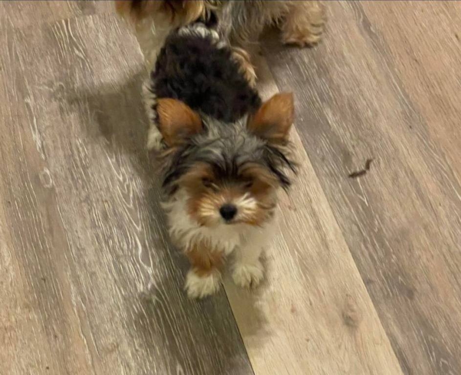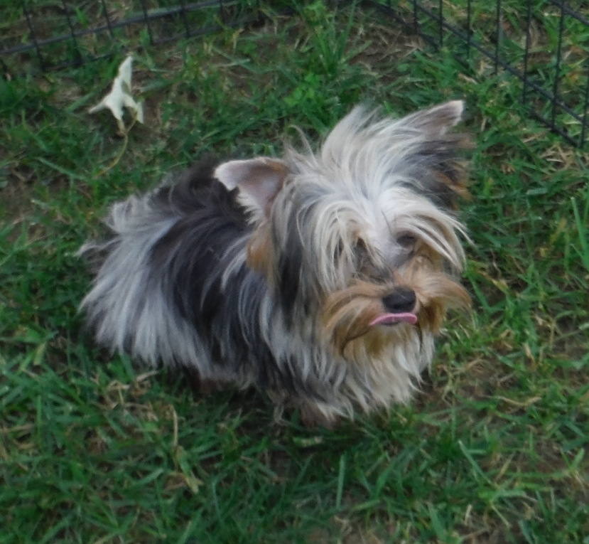 | Yorkie, Blue Merle "Pablo Picasso" A.P.R.I. C.K.C. & A.K.C. reg. This has got to be the sweetest Dog, I have ever met! He carries ALL colors. |